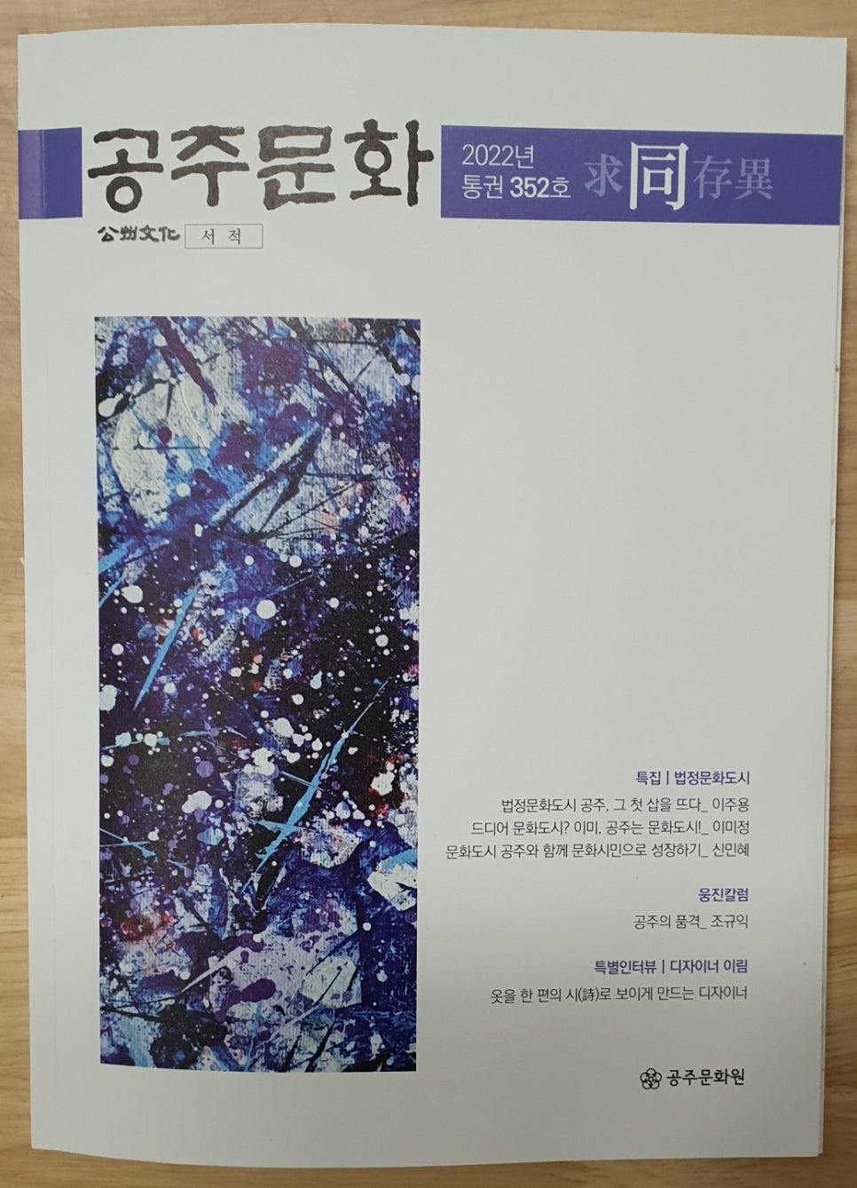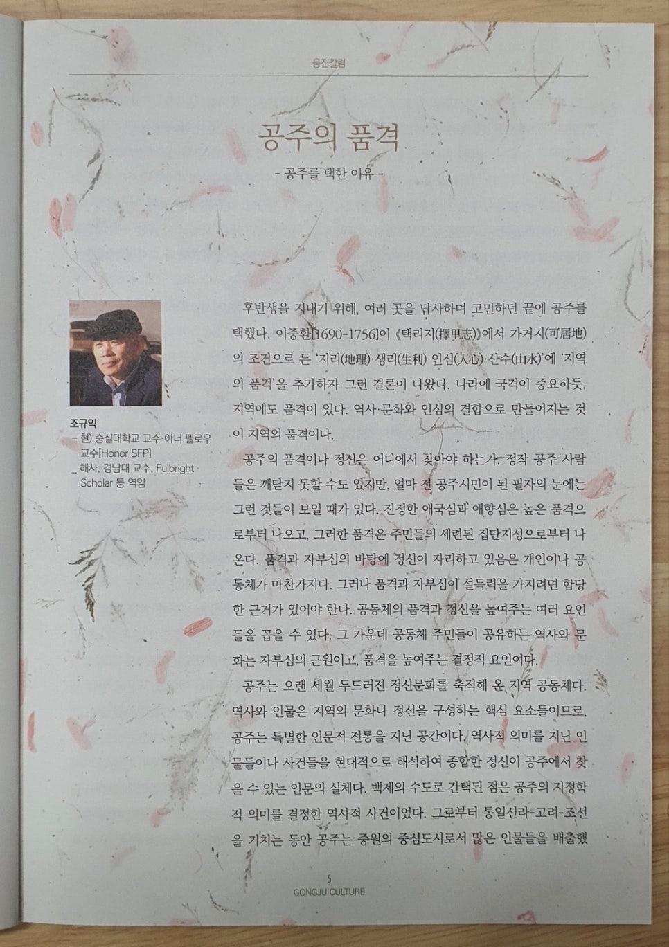 지역의 정신은 지역주민의 정신이다. 그 정신은 물질 아닌 역사와 문화, 전통을 바탕으로 형성된다. 역사와 전통 없는 지역이 어디에 있을까. 그러나 그런 것들을 찾아내고 소중히 보존하며 늘 새롭게 인식하려는 정신은 있는 곳도 있지만, 없는 곳이 더 많다. 따라서 현재에 조명된 과거, 그런 과거를 통해 미래를 내다보는 혜안(慧眼)을 바탕으로 다져져야 하고 지속되어야 하는 것이 공주의 정신이자 품격이다.♣