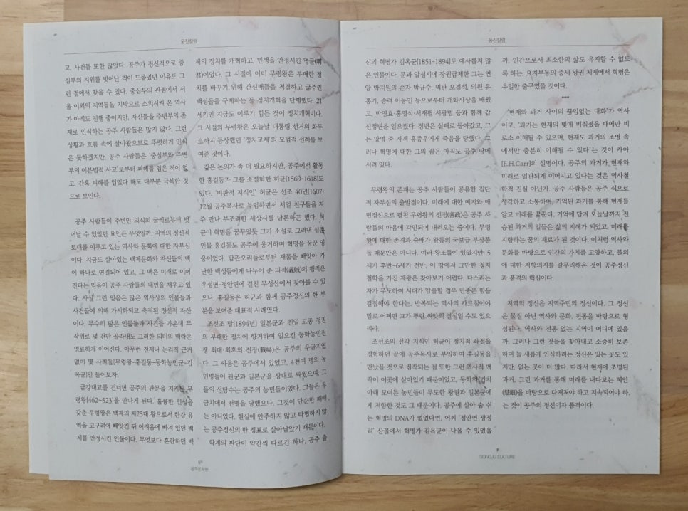 ‘현재와 과거 사이의 끊임없는 대화’가 역사이고, ‘과거는 현재의 빛에 비춰졌을 때에만 비로소 이해될 수 있으며, 현재도 과거의 조명 속에서만 충분히 이해될 수 있다’는 것이 #카아[E.H.Carr]의 설명이다. 공주의 과거가 현재와 미래로 일관되게 이어지고 있다는 것은 역사철학적 진실 아닌가. 공주 사람들은 공주 식으로 생각하고 소통하며, 기억된 과거를 통해 현재를 알고 미래를 꿈꾼다. 기억에 담겨 오늘날까지 전승된 과거의 일들은 삶의 지혜가 되었고, 미래를 지향하는 꿈의 재료가 된 것이다. 이처럼 역사와 문화를 바탕으로 인간의 가치를 고양하고, 불의에 대한 저항의지를 갈무리해온 것이 #공주정신과 품격의 핵심이다.