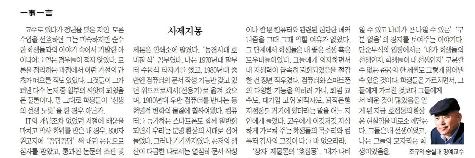 IT의 개념조차 없었던 시절에 배움을 마치고 박사학위를 받은 내 경우. 800자 원고지에 ‘꽁당꽁당’ 써 내린 논문으로 심사를 받았고, 통과된 논문의 조판 및 제본은 인쇄소에 맡겼다. ‘농경시대 호미질 식’ 공부였다. 나는 70년대 말부터 수동식 타자기를 썼고, 80년대 중반엔 컴퓨터의 문서작성 기능만 갖고 있던 워드프로세서(전용기)로 옮겨 갔으며, 80년대 후반 컴퓨터를 만나는 등 혁명적 변화의 물결에 휩싸여왔다. 컴퓨터를 능가하는 스마트폰도 함께 일반화되면서 우리는 분명 환상의 시대로 접어들었다. 그러나 거기까지였다. 논저의 생산이 다급한 나로서는 열심히 문서작성이나 할 뿐 컴퓨터와 관련된 현란한 메커니즘을 그 때 그 때 익힐 여유가 없었다. 그 단계에서 학생들은 내 좋은 선생 혹은 도우미들이었다. 그들에게 의지하면서 내 자생력이 급속히 퇴화되었음을 절감한 건 정년 직후였다.