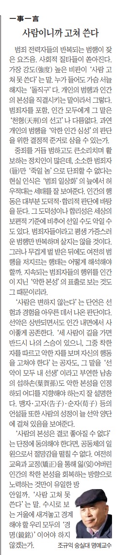 범죄 전력자들의 반복되는 범행이 잦은 요즈음. 사회적 질타들이 쏟아진다. 가장 강도(强度) 높은 비판이 ‘사람 고쳐 못 쓴다’는 말. 누가 들어도 가슴 서늘해지는 ‘돌직구’다. 개인의 범행과 인간의 본성을 직결시키는 말이라서 그렇다. 범죄자를 포함, 인간 모두에게 그 말은 ‘천형(天刑)의 선고’나 다름없다. 과연 개인의 범행을 ‘악한 인간 심성’의 판단을 위한 결정적 준거로 삼을 수 있는가.