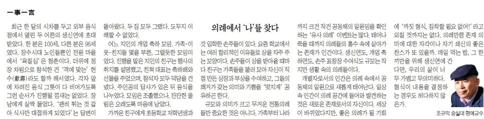 개별자로서의 인간은 의례 속에서 공동체의 일원으로 새롭게 태어난다. 일상 속 인간이 의례 공간에 들어와 발견하는 것은 새로운 존재로서의 자신이다. 세상이 바뀌었다지만, 좋은 의례가 될 기회에 ‘까짓 형식, 집착할 필요 없어!’라고 외칠 것까지는 없다. 의례만큼 존재의미에 대한 자각이나 자기쇄신의 좋은 찬스가 또 있을까. 매일 먹는 밥, 그 한 끼만을 위해 생신 연에 간다면, 우리의 삶이 너무 가볍고 무의미하다. 형식이 내용을 결정하는 경우도 허다하지 않은가.