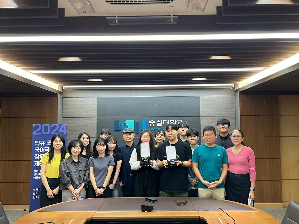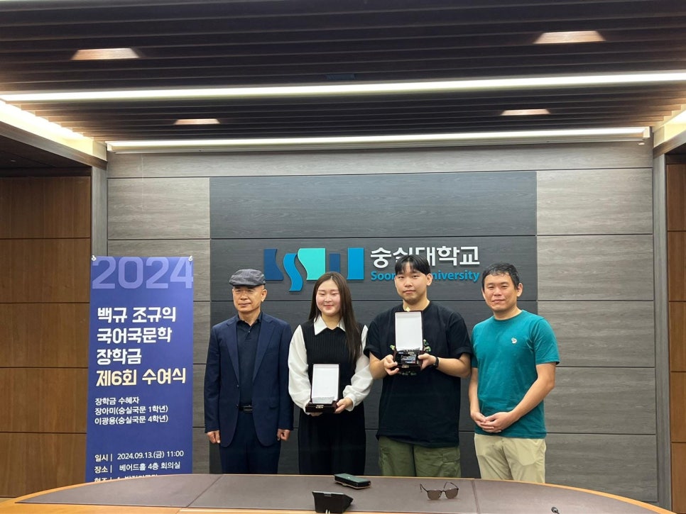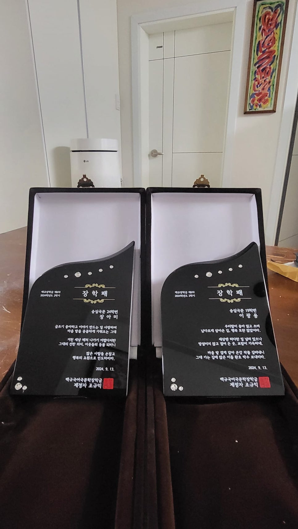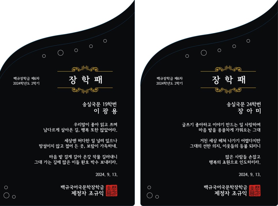 장학생 두 명[국어국문학과 24학번 장아미/19학번 이광용])에게 장학패를 건네는 마음이 즐겁고 행복했습니다.