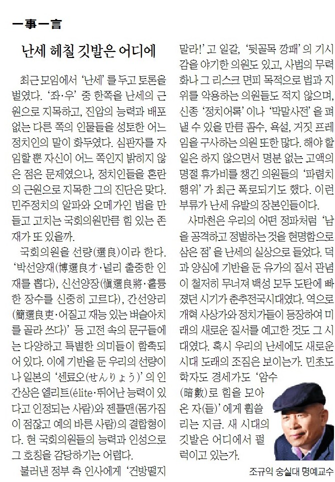 사마천은 우리의 어떤 정파처럼 ‘남을 공격하고 정벌하는 것을 현명함으로 삼은 점’을 난세의 실상으로 들었다. 덕과 양심에 기반을 둔 유가의 질서관념이 철저히 무너져 백성 모두 도탄에 빠졌던 시기가 춘추전국시대였다. 역으로 개혁 사상가와 정치가들이 등장하여 미래의 새로운 질서를 예고한 것도 그 시대였다. 혹시 우리의 난세에도 새로운 시대 도래의 조짐은 보이는가. 민초도 학자도 경세가도 ‘암수(暗數)로 힘을 모아온 자(들)’에게 휩쓸리는 지금. 새 시대의 깃발은 어디에서 펄럭이고 있는가.