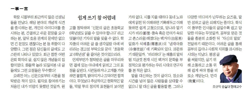 오래 전 어느 신문으로부터 시론을 청탁받은 적이 있다. 필자로 참여하기는 처음인 내가 미덥지 못했던 것일까. 원고를 청탁하며 ‘신문의 글은 초등학교 6학년생도 읽을 수 있어야 합니다.’라고 덧붙이던 기자의 말을 잊을 수 없다. 학자풍의 어려운 글 쓸 생각일랑 아예 버리라는 경고성 부탁으로 굳이 ‘초등학교 6학년생’을 끌어온 것이었으리라.