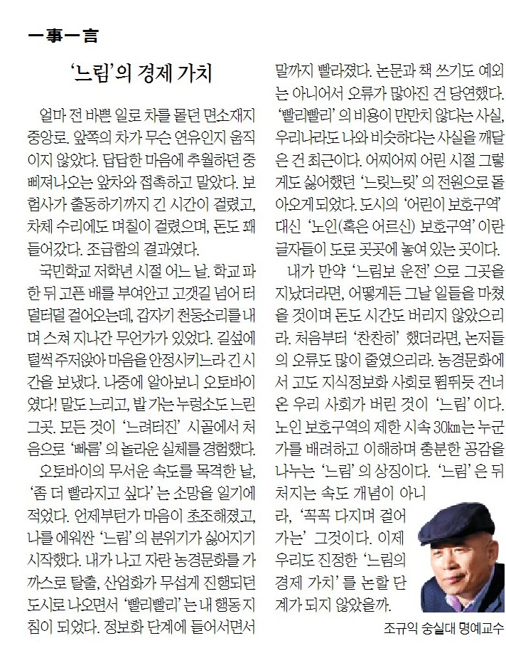 내가 만약 ‘느림보 운전’으로 그곳을 지났더라면, 어떻게든 그 날 일들을 마쳤을 것이며 돈도 시간도 버리지 않았으리라. 처음부터 ‘찬찬히’ 했더라면, 논저들의 오류도 많이 줄였으리라. 농경문화에서 고도지식정보화 사회로 뜀뛰듯 건너온 우리 사회가 버린 것이 ‘느림’이다. 노인보호구역의 제한 시속 30km는 누군가를 배려하고 이해하며 충분한 공감을 나누는 ‘느림’의 상징이다. ‘느림’은 뒤처지는 속도 개념이 아니라, ‘꼭꼭 다지며 걸어가는’ 그것이다. 이제 우리도 진정한 ‘느림의 경제 가치’를 논할 단계가 되지 않았을까.