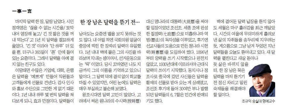 마지막 달력 한 장, 달랑 남았다. 시인 정재영은 ‘끊을 수 없는 시간을/토막 내어 염장해 놓고/긴 것 짧은 것을 꺼내 먹는다’고 1년 치 달력을 절묘하게 읊었다. ‘긴 것’이라야 ‘단 하루’ 더 있을 뿐. 더구나 365일이 ‘폰’ 안에 들어 있는 요즘이다. 그래서 달력을 아예 걸지 않는 친구도 있다.
