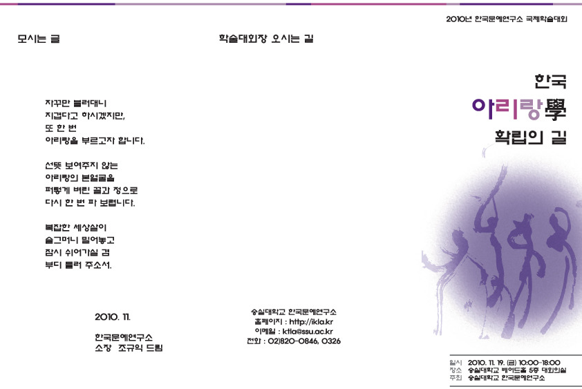 숭실대학교 한국문예연구소(소장 조규익 교수)에서는 2010년 11월 19일 10:00~18:00, 숭실대학교 베어드홀 5층 대회의실에서 “한국 아리랑學 확립의 길”이란 주제로 2010년 국제학술대회를 갖는다. 이 날 발표될 논문과 발표자는 다음과 같다.