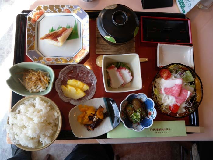 일본녹차로 갈증을 달래고 로비의 응접실로 내려가니 천리대학의 마츠오[松尾 勇] 교수가 우리를 반겼다. 참으로 우리말이 능숙한 젠틀맨이다. 그와 잠시 환담한 뒤 천리대학의 마사히코 이부리 총장과 20여명의 학자들[일본 전역에서 모인 조선학회 임원들]이 모여 있는 식당으로 안내되어 저녁식사를 겸한 환영행사를 가졌다. 참석자 개개인 앞에 놓인 커다란 도시락 형태의 식판에 맥주를 곁들인 ‘조촐하면서도 깔끔한’ 식사였다. 늘 지글지글 끓는 전골이나 고기구이 혹은 생선[회/매운탕]에 익숙한 나로서는 참으로 이색적인 경험이었고, 마지막 날 밤 이자까야(いざかや)에서의 간친회(懇親會)를 빼곤 일본 체류 내내 ‘도시락 스타일’의 식사가 동일하게 반복되었다.
