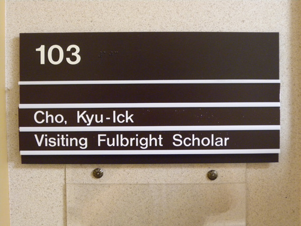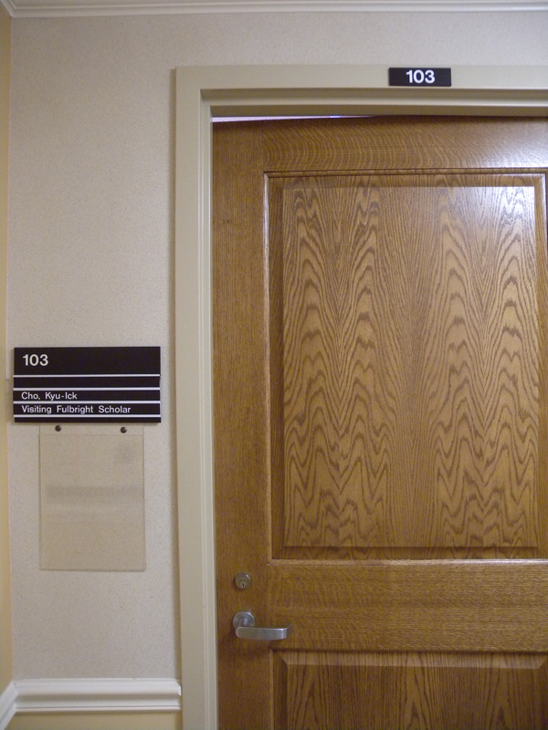 지도를 보며 학과 사무실과 연구실이 있다는 머레이(Murray)홀로 들어가니 건물 바로 1층에 널찍한 학과 사무실이 있었고, 비서 수잔과 다이아나가 우리를 반긴다. 그런데 학과 사무실 바로 옆에 낯익은 내 이름의 팻말이 걸린 ‘참한 연구실’이 마련되어 있는 것 아닌가. 참으로 반갑고도 고마운 일이었다. 수잔이 건네 준 열쇠로 문을 따고 들어가니 카펫 깔린 방 안에 정갈한 책상과 책장, 컴퓨터와 전화기 등 각종 사무용 비품들이 세심하게 갖추어져 있고, 나무 우거진 캠퍼스의 풍광이 한낮의 열기와 함께 창문 가득 밀려들고 있었다.