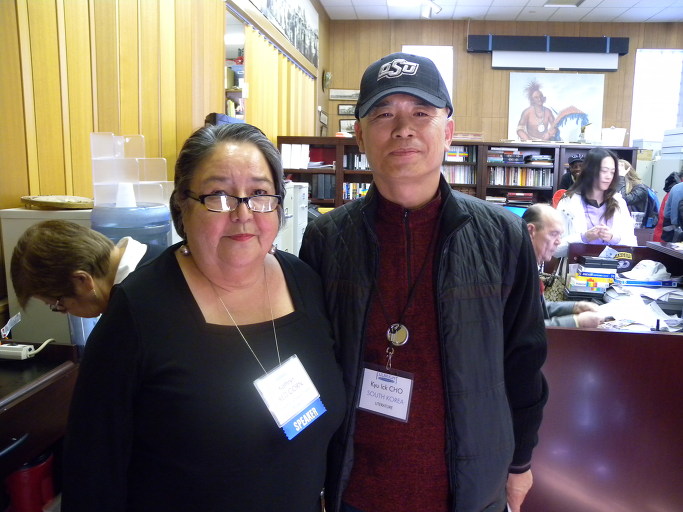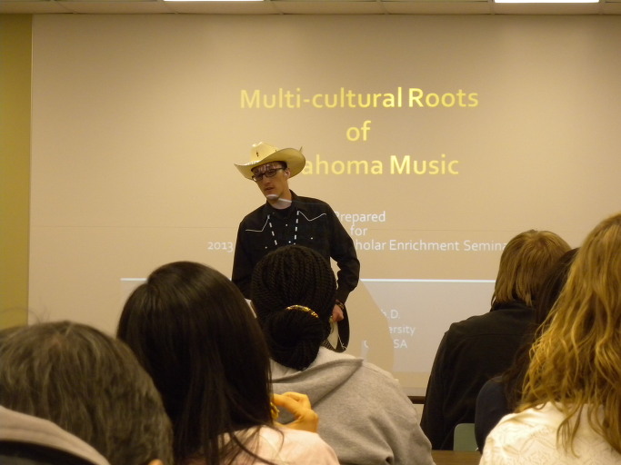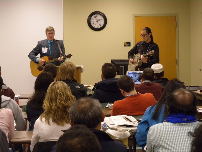 점심을 먹으면서 우리는 “오클라호마 음악에 미친 복합문화적 영향[The Multi-Cultural Influences of Oklahoma Music]”이란 제목의 강연 겸 공연을 접하게 되었다. 강사는 Dr. Hugh Foley[Professor of Fine Arts at Rogers State University]였고, 그 아들이 특이한 복장으로 나와 인디언 음악을 들려주는 것이었다. ‘새로운’ 옛날 음악을 새파란 젊은이로부터 듣는 것도 이색적이었지만, 무엇보다 부자가 음악으로 통해 있는 모습을 보는 건 참으로 아름다웠다. 아버지가 이론으로 설명하면 아들은 타악기로 직접 반주를 하며 노래를 불렀다.