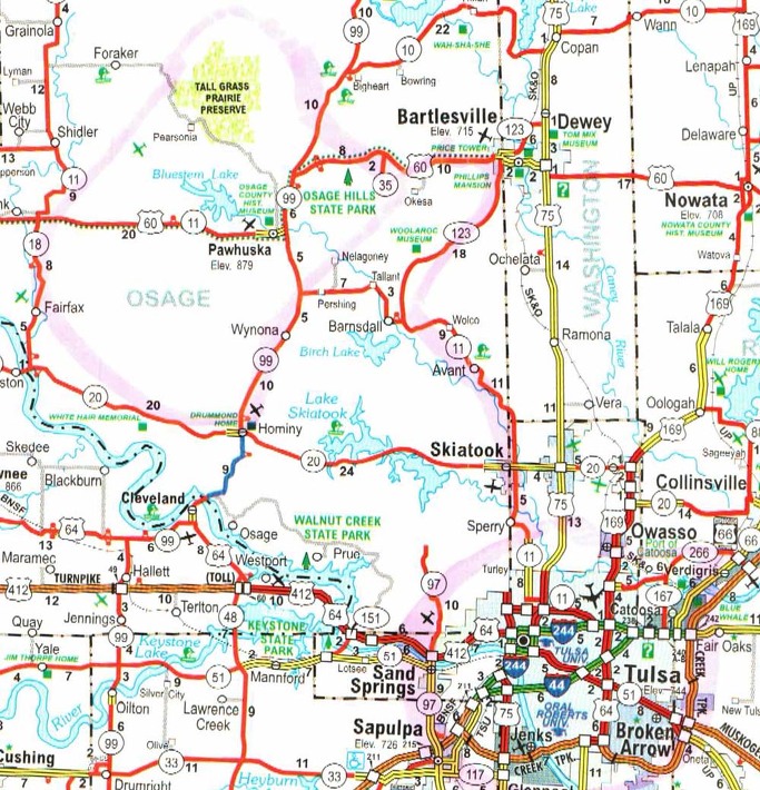 털사 시티와 오세이지 보호구역 및 톨그래스 프레이리가 나온 지도