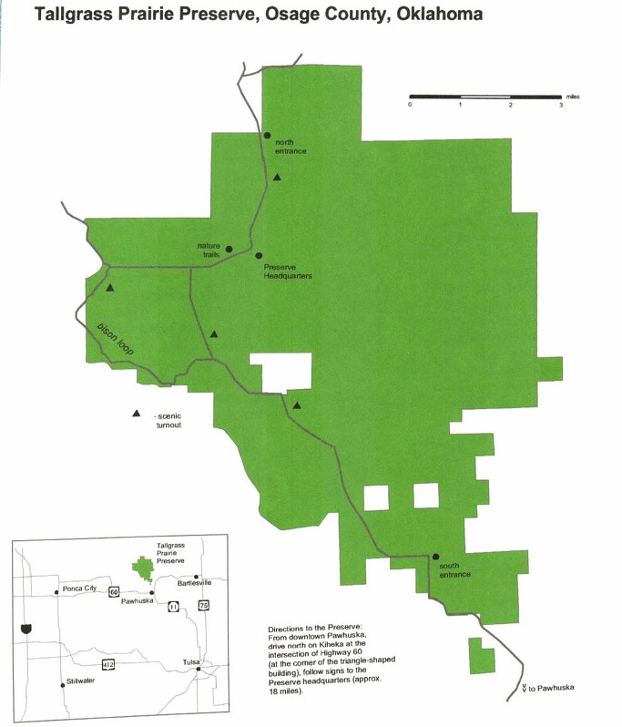 오세이지(Osage) 카운티에 속해 있으며, 포허스카(Pawhuska) 다운타운으로부터 근거리에 위치한 TGP. 초원 보호구역으로는 지구상에 남아 있는 가장 큰 역사의 현장이자 유물인 셈이다. 원래 텍사스로부터 마니토바(Manitoba)까지 14개 주의 부분들을 포함하고 있었으나, 도시의 확장과 농지의 전용으로 남아 있는 공간은 원래에 비해 겨우 10% 정도라 한다. 엄청난 크기와 기괴한 표정의 검정 소 바이슨(bison)들이 무리를 지어 주인 행세를 하고 있는 생태공간이다.