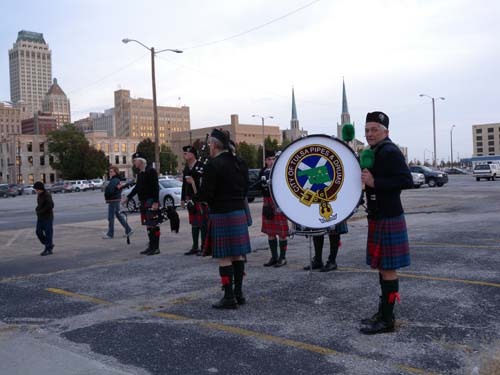 시민 마라톤 대회를 축하하기 위해 공연 준비를 하는 악단(City of Tulsa Pipes & Drums)