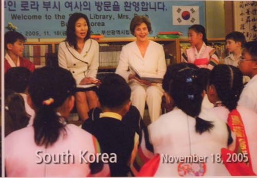 2005년 11월 한국을 방문한 로라 여사가 어린이들과 함께