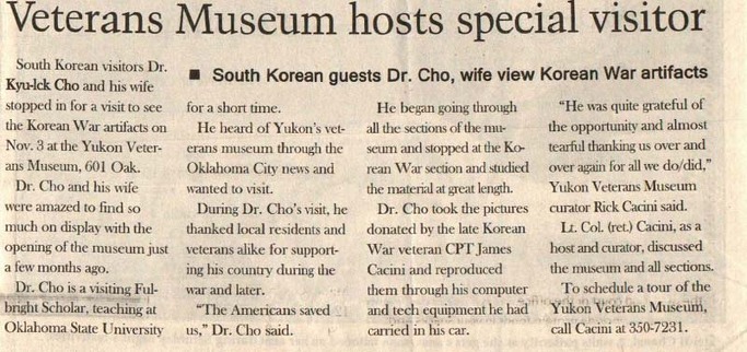 한국의 조 박사 부부가 11월 3일 오우크 가(街) 601번지[601 Oak.]에 있는 유콘 베테란스 뮤지엄의 한국전 관련 유물들을 살펴보기 위해 이곳을 방문했다. 조 박사와 그의 부인은 바로 몇 달 전에 개관한 뮤지엄에 전시된 많은 유물들을 보고 놀라워했다. 조 박사는 잠시 오클라호마 주립대학에서 연구와 강의를 수행하고 있는 ‘풀브라이트 방문학자’다. 그는 오클라호마 시의 소식지를 통해 유콘의 베테란스 뮤지엄에 관하여 듣게 되어, 이곳을 방문하고자 한 것이다. 조 박사가 이곳을 방문하는 동안, 그는 전쟁 기간과 그 후에 자신의 나라를 도와 준 데 대하여 이 지역 주민들과 참전용사들에게 감사의 뜻을 표하며, “미국인들이 우리를 구해주었다”고 그는 말했다. 그는 뮤지엄의 모든 섹션들을 둘러보던 중 한국전 섹션에서 발길을 멈추었고, 오랫동안 그 자료들을 살폈다. 조 박사는 거기서 한국전 참전용사 고(故) 제임스 카치니(James Cacini) 대위가 기증한 사진들을 발견했고, 그것들을 그가 차에 싣고 다니는 컴퓨터와 몇몇 기계장치를 통해 복제했다. “그는 이런 기회를 갖게 된 것에 대하여 아주 고마워했고, 우리가 하고 있고 해 온 모든 일들에 대하여 거듭거듭 눈물겹도록 고마워했어요.” 라고 유콘 베테란스 박물관의 큐레이터 릭 카치니(Rick Cacini) 씨는 말했다. 주빈이자 큐레이터로서 카치니 예비역 중령은 뮤지엄과 그 안의 모든 부분들에 관하여 설명했다. 유콘 베테란스 뮤지엄 방문 계획을 갖고 있을 경우, 카치니 씨에게 전화[350-7231]하면 된다.