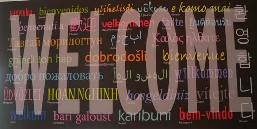 66번 도로 박물관 로비에 각국어로 쓰여진 인사말 간판