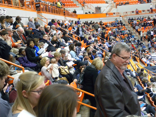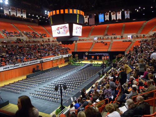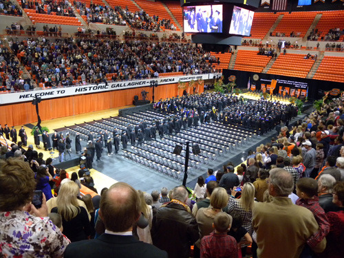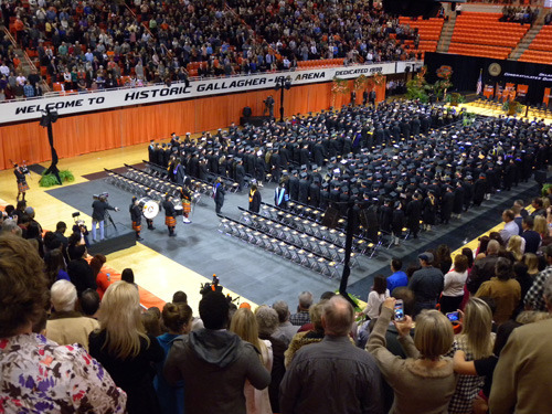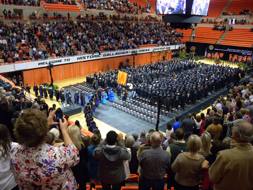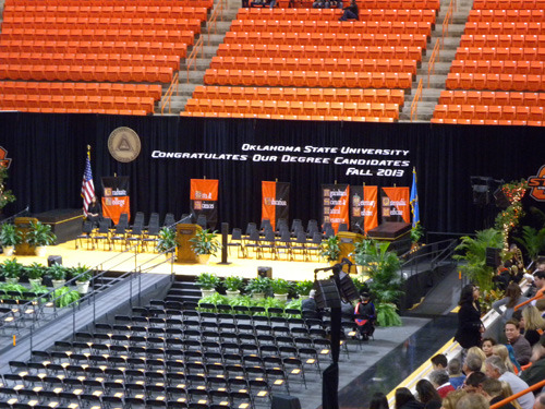 졸업생들의 가족과 친지들은 물 밀 듯이 밀려들었으나, 모두 정시에 입장을 끝내고 경사 진 3면의 관객석에 안전하게 좌정했다. 식장인 실내 농구장의 바닥에는 졸업생들이 앉을 의자들이 질서정연하게 놓여 있고, 정면의 단상에도 그리 많지 않은 좌석들이 마련되어 있었다. 예정된 시각에 총장이 단상으로 나오더니 놀랍게도 그 스스로 식을 주재하기 시작했다. 총장의 말에 따라 이 대학 파이프 밴드가 행진곡을 연주한 뒤, 브라스 밴드의 연주에 맞추어 졸업생들이 두 줄로 들어와 마련된 의자에 착석하기 시작했다. 졸업생들의 착석이 끝나자 스코틀랜드 전통복장을 한 파이프 밴드의 연주와 선도로 단상에 앉을 인물들이 질서정연하게 입장했다. 그 다음 장내에 있는 모든 사람들이 일어나 미국 국가[The Star Spangled Banner]를 ‘우렁찬 목소리’로 제창했다. 이어 오클라호마 주의 노래인 ‘Oklahoma’를 부른 다음 본격적인 졸업식이 진행되었다.