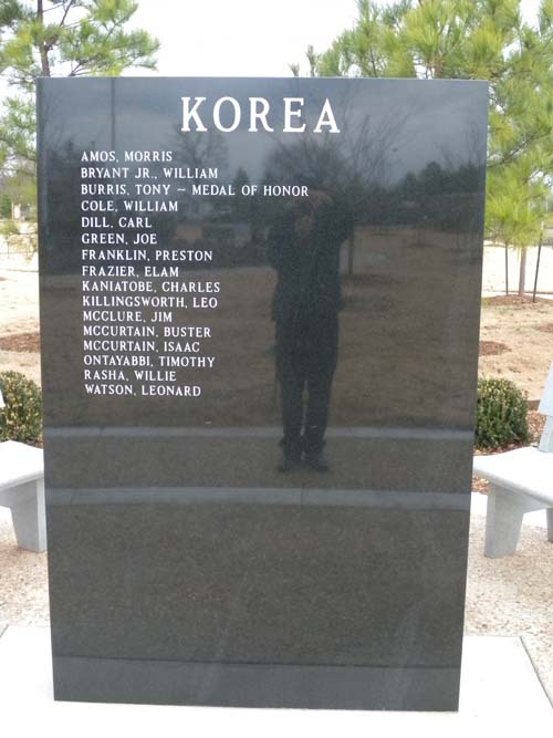 촉토 네이션 뮤지엄의 한복판에도 각종 전쟁에서 활약한 촉토족 전사들의 활약상이 자리 잡고 있었다. 특히 1・2차 세계대전에서 암호 해독병으로 활약한 그들의 공적이 크게 부각되어 있었다. 촉토족 언어가 전선에서 연합군 측 암호로 쓰인 점을 이 뮤지엄에서 비로소 알게 되었는데, 어쩌면 그것은 한국전에서도 활용되었을 것이다. 미국의 어디에서나 볼 수 있는 것처럼 이 뮤지엄의 뜰에도 전몰용사를 추모하는 비석이 서 있었고, 한국전에서 사망한 용사들의 이름이 나열되어 있었다. ‘Amos, Morris/Bryant Jr., William/Burris, Tony *winner of Medal of Honor/Cole, William/Dill, Carl/Green, Joe/Franklin, Preston/Frazier, Elam/Kaniatobe, Charles/Killingsworth, Leo/Mcclure, Jim/Mccurtain, Buster/Mccurtain, Isaac/Ontayabbi, Timothy/Rasha, Willie/Watson, Leonard’ 등 16명의 혈기방장했을 젊은이들이 전사자 추모비에 자랑스럽게 올라 있었다. 이 가운데 명예훈장을 받았을 정도로 전공이 혁혁했던 인물 Burris, 형제가 사망한 것으로 보이는 Buster와 Isaac 등은 한동안 내 눈길을 끌었다. 추모비 뒤쪽에 촉토족의 용맹을 대표하는 ‘붉은 전사[Red Warrior]’가 적의 가슴을 향해 활을 힘껏 당기는 모습의 동상이 서 있는데, 이들 전몰용사들이야말로 그의 진정한 후예들이 아니겠는가.