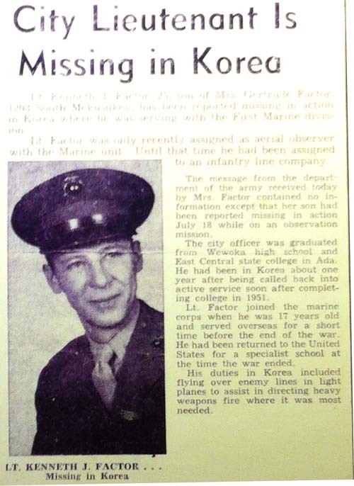 한국전에서 실종된 팩터(Kenneth J. Factor) 중위