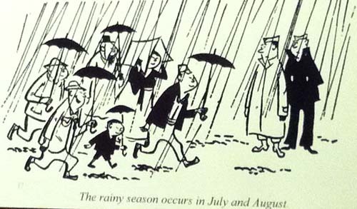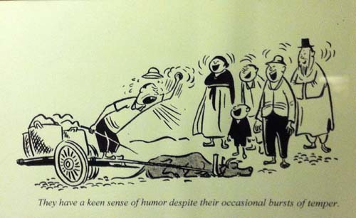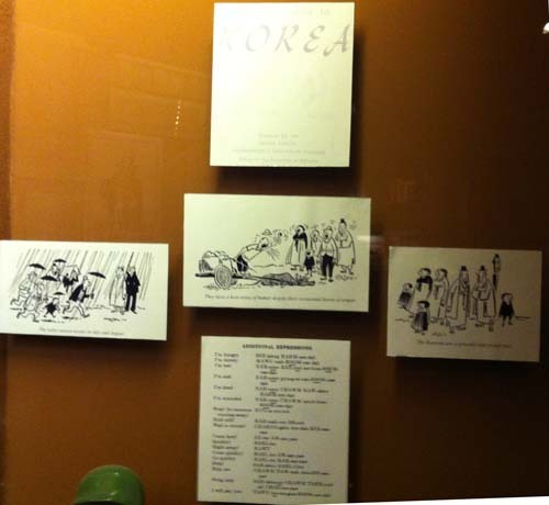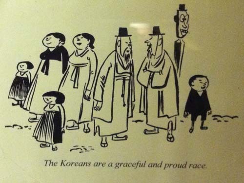 그러나 당시 그들이 만들었을 것으로 추정되는, 한국에 관한 귀한 자료들이 여러 점 전시되어 있었다. 그 때의 한국인들에 관한 캐리커츄어(caricature) 석 점인데, 그림도 그림이려니와 그 밑에 달아둔 멘트가 감동적이었다. 약간 서양식으로 변이된 복장의 노인 둘, 여인네 둘, 꼬마 셋, 장승 하나를 그린 다음, ‘한국인들은 우아하고 자부심 강한 민족[The Koreans are a graceful and proud race]’이라는 멘트를 달아놓은 것이 그 하나이고, 소달구지를 몰고 가던 중 넘어진 소에게 화를 내는 주인과 깔깔대며 재미있어 하는 구경꾼들을 그린 다음 ‘한국인들은 가끔 화를 내면서도 예리한 유머감각을 지녔다[They have a keen sense of humor despite their occastional bursts of temper]’는 멘트를 달아 놓은 것이 두 번째 것이며, 장대비가 쏟아지는 속에 우산을 쓰고 가는 사람들을 그린 다음 ‘한국에서는 7월과 8월에 장마철이 시작된다[The rainy season occurs in July and August]’는 사실 관계 멘트를 달아놓은 것이 세 번째 것이었다. 이들이 얼마나 따스하고 긍정적인 시각으로 한국인들을 관찰했는가를 알 수 있게 하는 사례들이었다.