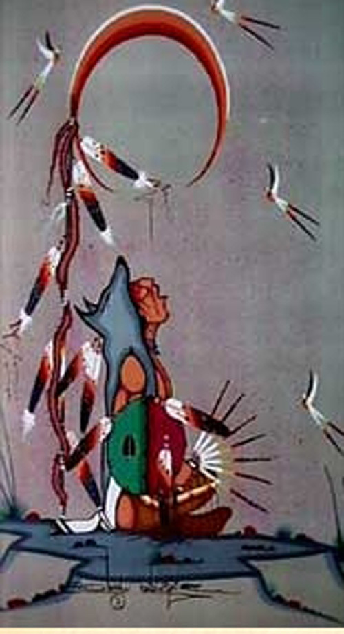 설명이 끝나고, 족장 뒤편에 있는 문장에 대하여 물었다. 인디언 부족들을 방문할 때마다 느끼는 것은 그들의 실(Seal) 즉 문장(紋章)이 가장 중요한 상징이라는 사실이었다. 각 문장에는 해당 부족들의 현실과 꿈, 그리고 철학이 응축되어 있다고 보기 때문이다. 그는 다음과 같이 설명했다. 이 문장은 1978년 밥 머레이(Bob Murray)가 디자인한 것인데, ‘생명의 순환 고리’를 의미하는 원은 신성한 독수리의 깃으로 장식된 아이오와 전사의 전투모를 상징한다. 원 안에는 신성한 파이프[담뱃대]가 있는데, 아이오와 족의 각 클랜(clan)은 그 자신들의 신성한 파이프를 클랜 우두머리 집에서 가까운 방어구역 안에 갖고 있으면서 각종 제사나 의식(儀式), 특히 평화와 동맹을 맺는 절차들에 사용했다고 한다. 원 안의 쟁기는 아이오와 족의 농경 전통을 나타내며, 원의 양쪽에 매달려 있는 총채 비슷한 털 자루는 전통적으로 버팔로의 은신을 본뜬 떨림을 나타낸다. 그리고 그것은 아이오와 족의 일상생활에서 가장 중요한 활과 화살을 운반하는데 사용되었다. 원 아래 쪽의 독수리 깃털 네 개는 사방의 바람과 사계절을 나타내는데, 전통적으로 아이오와 족은 독수리를 존경해왔으며, 부족과 신을 매개하는 것이 바로 독수리라는 믿음을 가지고 있다는 것이다. 그렇게 단순치 않은 의미가 바로 이 문장에 숨어 있었다.
