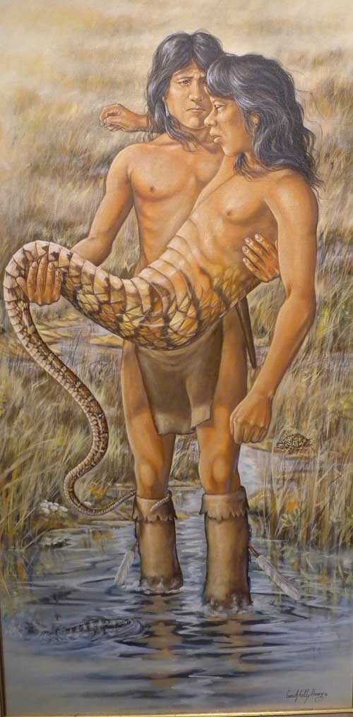 뿐만 아니라 세미놀의 역사나 의례 등 전통적인 삶을 묘사한 현대 예술가들의 그림들이 독립된 공간에 전시되어 있었는데, 그 속에 흥미로운 그림 하나가 있고, ‘뱀으로 변한 아우’라는 제목이 합당할 법한 설화 한 편이 적혀 있었다. 독자들의 흥미를 위해 그 설화의 서사적 골자를 들기로 한다.
