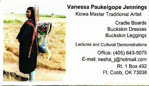 그렇다면, 카이오와 족 여성은 어땠을까. 칼 선생에 따르면, 그의 카이오와 족 부인 바네사(Vanessa Paukeigope Jennings)는 미국의 유명 인사였다. ‘카이오와 족 전통예술의 거장’이란 공식직함을 갖고 있는 그녀는 의례 의상 제작자[Kiowa-Apache-Gila River Pima regalia maker]이자 의상 디자이너였으며, 크레이들 보드의 제작자이자 비드(bead) 아티스트를 겸한 인물이었다.