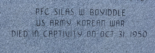 추모비의 아래쪽에 ‘미 육군 일병 실라스 W. 보이들, 한국전에서 1950년 10월 31일