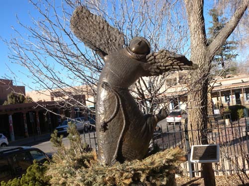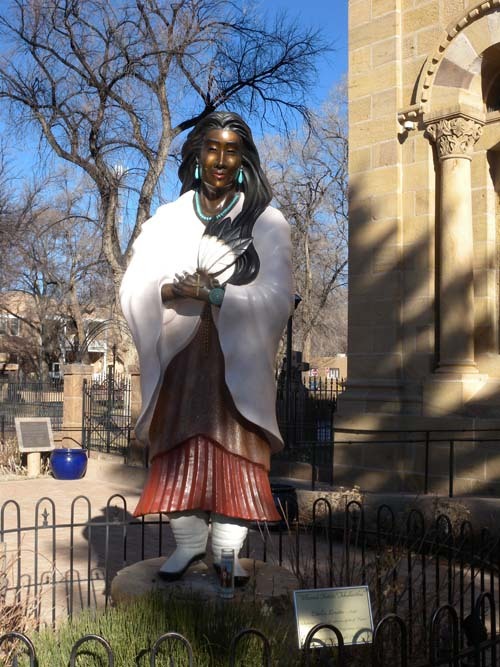 산타페의 구시가지에서 가장 중요한 포인트는 ‘아씨시의 성 프란체스코 바실리카 대성당[Cathedral Basilica of St. Francis of Assisi]’이었다. 사실 뉴멕시코의 어느 도시에서도 프란체스코 성인을 모신 성당들은 어렵지 않게 만날 수 있었다. 그리고 이 성당을 중심으로 시가지가 형성된 도시들도 적지 않았다. ‘산타페 로만 가톨릭 대 주교구[The Roman Catholic Archdiocese of Santa Fe]’의 모태 교회가 바로 이 성당인데, 이 성당의 뜰엔 눈길을 끄는 또 한 사람이 서 있었다. 여성 성인으로 추존된 인디언 출신의 가데리 데각위타(Kateri Tekakwitha, 1656~1680). 순결의 덕목과 육신의 고행을 실천함으로써 짧은 생애에 많은 기적을 이룬 그녀였다. 결국 1980년 요한 바오로 2세에 의해 시복(諡福)되고, 2012년에는 교황 베네딕트 16세에 의해 시성(諡聖)된 스물넷의 아름다운 그녀가 성스러운 미소를 머금은 채 그곳에 서 있었다.