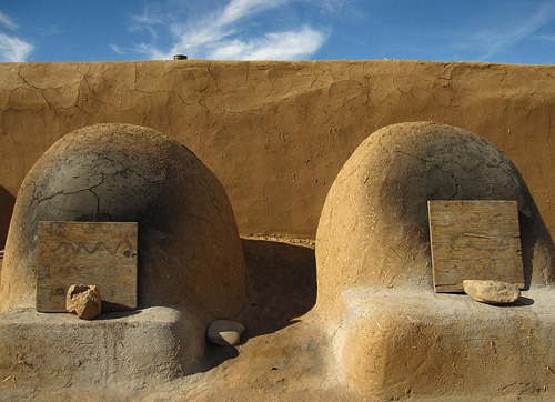 타오 푸에블로 경내의 어도비 주거지. 앞 쪽의 반타원형 구조물은 빵을 굽는 화덕.