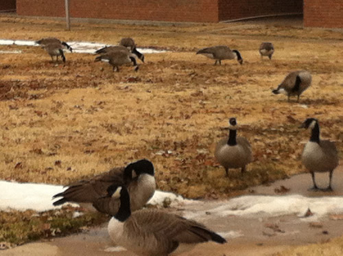 아파트 뒤켠 풀밭에서 식사하고 있는 기러기들[Canadian Goose]