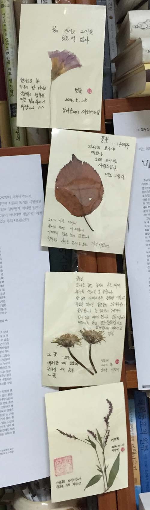 그 긴 세월. 목소리 한 번 들려주지 않은 그였다. 의령의 남강에서 길어 올린 ‘청수 같은 글 몇 단락’으로 할 말을 대신하던 그였다. 이역만리 해외에서도 버튼만 누르면 이웃집 친구처럼 대화할 수 있는 요즈음이다. 맑은 글로, 말린 들꽃으로 수다를 대신할 수 있다니! 정녕 이건 ‘시대를 거스르는 기적’이다. 진정으로 아껴야 할 추억을 간직한 사람들이라면, 그들 사이에 무슨 말이 필요할까. 석가모니가 모여 있던 제자들에게 연꽃을 들어보이자, 그 가운데 가섭만이 홀로 빙그레 웃었다지 않는가. 그래서 ‘염화시중(拈華示衆)의 미소’란 말이 나왔고. 원래 그는 나의 제자였으나, 의령 남강 가에서 이십년 가까이 수도했으니, 그와 내가 자리바꿈할 때도 되었으리라. 그래서 그가 자신의 마음을 담아 들어 보이는 ‘말린 들꽃’에 내 미소로 답하노라. 부처의 연꽃에 미소로 답한 그 옛날의 가섭처럼.<2005. 2. 24.>