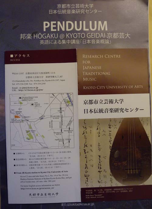 나는 진행 중인 연구 테마의 콘텍스트를 찾아 여기로 온 것이다. 우리 음악과 함께 일본음악, 중국음악은 그 핵심이었다. 그간 해오던 공부를 마무리하려니 그런 것들에 대한 무지가 나를 씁쓸하게 했다. 아무리 현란한 분석의 칼날을 들이댄들 콘텍스트를 고려하지 않은 텍스트가 무슨 의미를 가질 수 있을까. 대충 덮어 둘까 고민하던 중 국악학회에서 이메일이 날아왔다. 교토시립예술대학 일본전통음악연구센타의 ‘일본음악 집중강좌’ 소식이었다. 매력적인 내용의 강의 소식이 그 연구소의 홈피에 일목요연하게 올라 있었다. 망설일 필요가 없었다. 즉시 신청하고 센터의 디렉터이자 강의자인 앨리슨 토키타(Alison Tokita) 박사와 이메일을 주고받기 시작했다.[그는 토키타란 일본인과 결혼하여 토키타란 성을 사용하고 있었다. ‘토키타 센세이’ 혹은 ‘토키타 박사’란 명칭으로 불러주길 원했다. 이하 토키타 선생이라 부른다.] 별 반응을 기대하지 않던 한국에서 누군가가 온다 해서 그랬을까. 아니면 여러 가지의 내 물음들에서 다소간의 어떤 진지함이 느껴져서 그랬을까. 득달같은 답신 메일들로부터 갈수록 끈끈한 정이 묻어나왔다. 귀찮은 숙소 문제까지 슬쩍 떠넘기자, 학교 가까운 곳의 호텔을 찾아 예약과 확인까지 해주는 게 아닌가. ‘동양인으로 바뀐 서양인이다!’라고 나름대로 결론을 내린 것도 그 때문이었다.