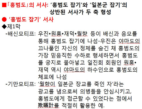 ‘홍범도 잡기’와 ‘일본군 잡기’라는 상반되는 서사들을 작품의 두 축으로 내세우고, 각각의 범주에 ‘배신•기만•날조•염탐•사냥•함정•복수’ 등의 모티프를 설정함으로써 ‘민족에 대한 사랑과 미래에 대한 희망’이라는 주제를 구현할 수 있었다는 것.