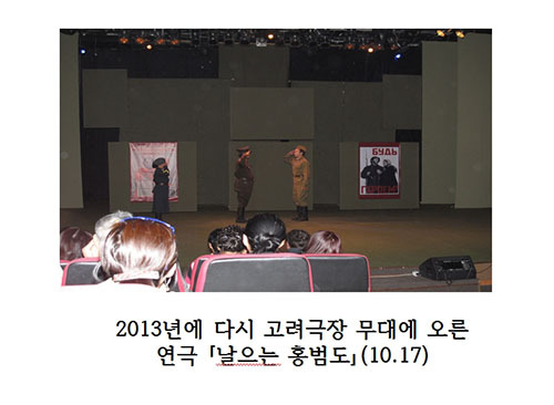 1942년 완성된 「홍범도」(초연 당시 제목은 「의병들」)는 같은 해 최길춘의 연출로 드디어 무대에 올려졌다. 원래 태장춘은 「홍범도」를 3부작(‘사냥꾼 출신 홍범도의 투쟁을 그려낸 「의병들」-1부/볼셰비키 혁명의 영향 아래 붉은 빨치산의 지휘자가 되는 것-2부/레닌과의 만남 이후 이상적이며 분명한 혁명가 혹은 국제주의자가 되는 것-3부’)으로 완성하려는 생각을 갖고 있었다. 그러나 장군이 1943년 별세하면서 그 계획은 무산되어 버렸다. 「홍범도」는 1947년에 이길수의 연출로, 1957년에 채영의 연출로, 1960년에 맹동욱의 연출로 연거푸 무대에 올려졌고, 2013년에는 ‘날으는 홍범도’로 개제(改題)되어 무대에 올려졌다. 이때의 연출가가 바로 이번에 직접 참여한 이 올레그 선생이었다. 바로 그 분이 발표 시간 내내 청중석에 앉아 계셨다.