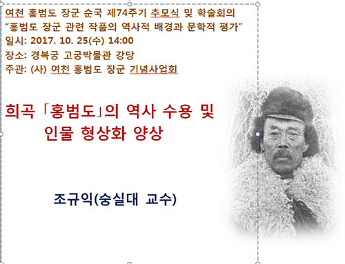 맑은 가을날 오후. ‘여천 홍범도 장군 순국 제74주기 추모 및 학술회의’에서 논문을 발표하기 위해 경복궁 고궁박물관 별관 강당을 찾았다. 꽤 많은 인사들이 모여있었다. 알 만한 사람들도 있었지만, 대부분은 모르는 사람들이었다. 홍범도기념사업회의 이종찬 이사장이야 원래 유명한 분이니 말할 필요도 없지만, 내 논문의 토론자로 나선 최영근 선생(알마틔 고려극장 문예부장), 반병률 교수(외국어대), 김보희 박사, 장세윤 박사(동북아 역사재단 한일관계연구소 소장) 등은 오랜 인연들이다. 특히 희곡 「날으는 홍범도」를 2013년에 연출한 리 알레그 선생이 모스크바로부터 와 있었다. 뜻하지 않은 만남에 감회가 깊었다.