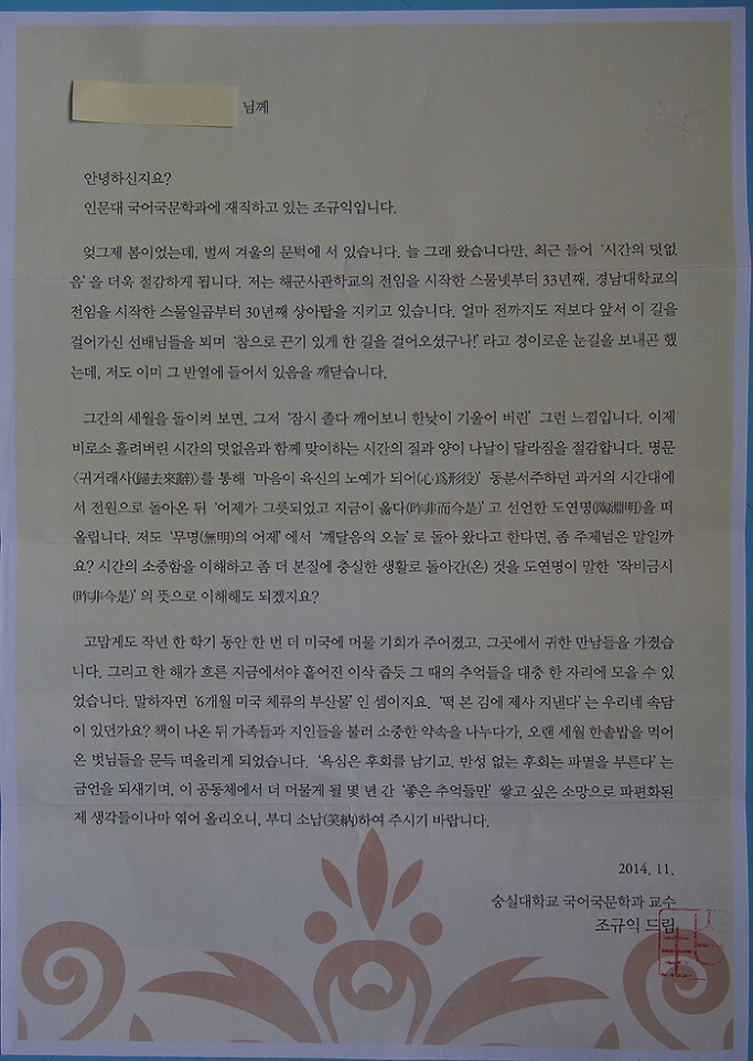 그리고 오늘 아침. 논문을 쓰다가 책 한 권이 필요하여 책장을 뒤지던 중, 책들 속에 끼여 질식하기 직전의 <<인디언과 바람의 땅 오클라호마에서 보물찾기>>를 발견했다. 책을 펼치자 ‘이쁘게’ 편집•출력된 서한이 접힌 채로 툭 떨어졌다. 아, 바로 내가 정성스레 작성하여 ‘교수들에게 보낸’ 그 편지였다. 읽어보니, 숫자(33→36/30→33)만 바꾸면 현재의 내 상황을 정확히 드러낼 만한 내용이었다. 교수직이 얼마나 ‘따분한’ 생활인지, 이 글을 읽고 비로소 깨닫게 되었다. 이 편지를 버리기가 너무 아까웠다. 그래서 숫자만 바꿔 이곳에 올리고, 그 때 그 편지와, 그 글에서 숫자만 바꾼 ‘숭실 근속 30년의 인사장’을 늦었지만 이곳에 올린다.