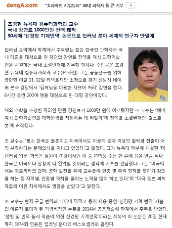 딥러닝 분야에서 학계의 주목을 받는 젊은 한국인 과학자가 국내 대중을 대상으로 연 강연의 강연료 전액을 여성 과학 기술인을 지원하는 국내 소셜 벤처에 기부해 화제다. 주인공은 조경현 뉴욕대 컴퓨터과학과 교수(33·사진). 그는 공동연구를 위해 방한한 이달 11, 12일 커넥트재단 초청으로 경기 성남시 네이버 본사 강당에서 ‘딥 러닝을 이용한 자연어 처리’ 강연을 했다. 8시간 동안 200여 명을 대상으로 한 대형 강연이었다.