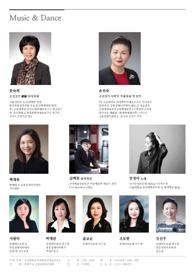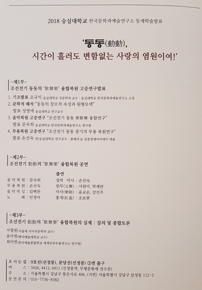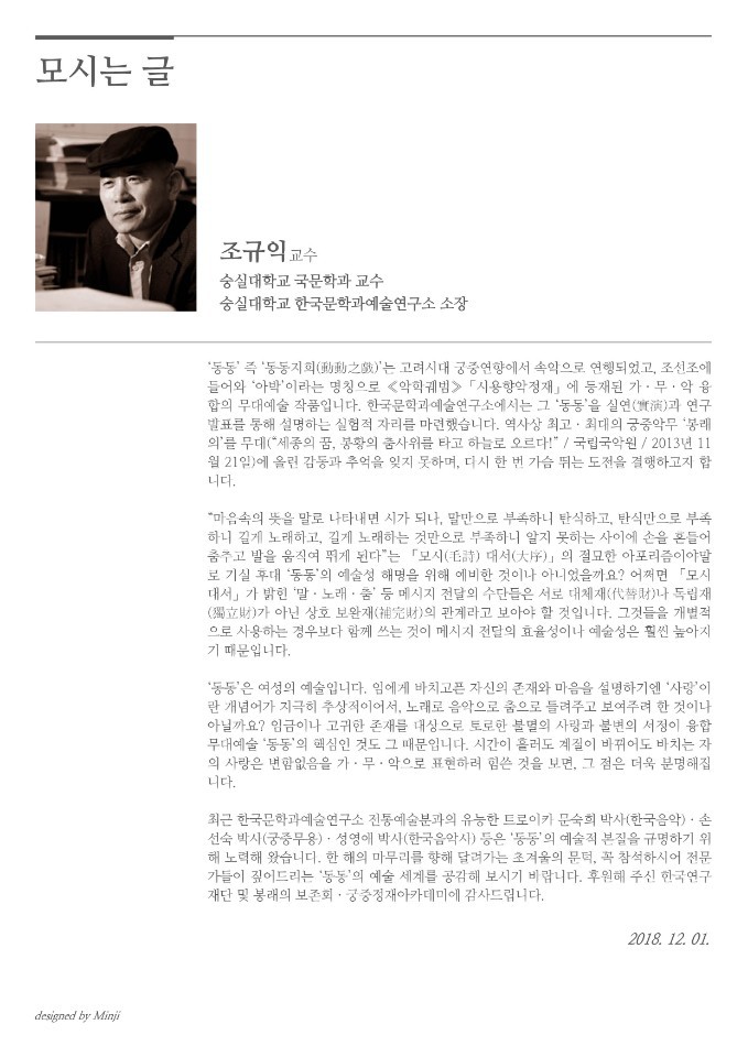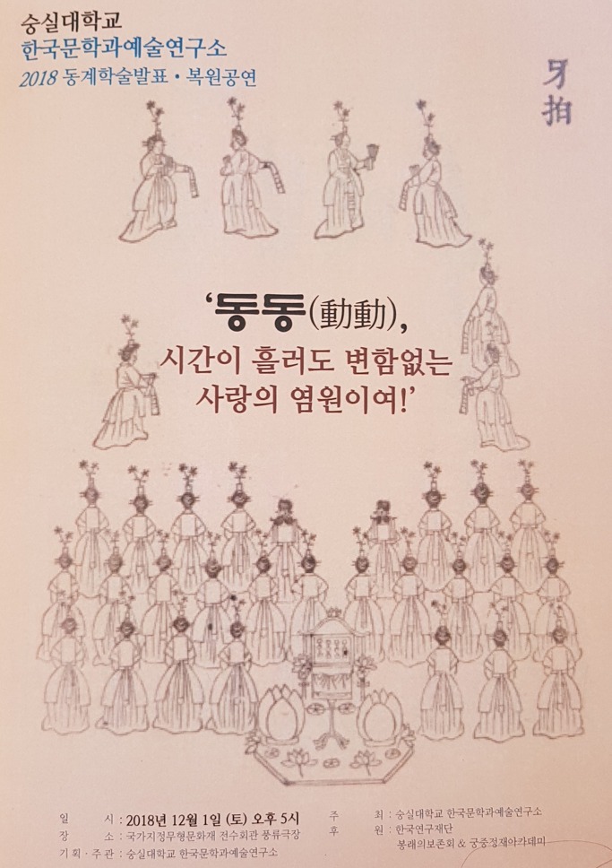 최근 한국문학과예술연구소 전통예술분과의 유능한 트로이카 문숙희 박사(한국음악)•손선숙 박사(궁중무용)•성영애 박사(한국음악사) 등은 ‘동동’의 예술적 본질을 규명하기 위해 노력해 왔습니다. 한 해의 마무리를 향해 달려가는 초겨울의 문턱, 꼭 참석하시어 전문가들이 짚어드리는 ‘동동’의 예술 세계를 공감해 보시기 바랍니다.