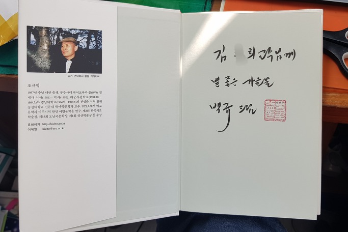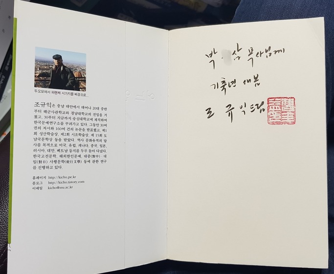 후배로부터 그 책 사진들을 받아든 순간, 내 책을 받았을 그 사람들의 얼굴이 떠올랐다. 다섯 사람 모두 바로 눈앞에 앉아 있는 듯 생생했다. 서운한 순서로 말하면 제자, 대학 후배, 몇 년 전 정년퇴임한 교수(*그는 현재 목사로 활동 중이다!), 문학평론가로 활동중인 다른 대학 교수 등으로 나열된다. 갓 펴낸 전공 책에 ‘박학다사(博學多思)’란 소망 섞인 헌사를 써서 제자에게 건넸으니, 당시 나는 그를 얼마나 아꼈던 것일까. 그 다음이 대학 후배. 1년 후배였으나, 학창 시절에는 사적인 만남이 거의 없었던 존재였다. 시내 모 대학에 재직하던 그는 언젠가부터 내가 재직하고 있는 대학에서 박사 공부를 했고, 학위를 받은 후에는 가끔 강의를 나오기도 했다. 강의가 끝나면 종종 연구실로 찾아왔고, 함께 점심이나 저녁식사를 하면서 세상 돌아가는 이야기도 곧잘 나누던 사이였다. 시원치는 않으나 첫 수필집을 ‘소람(笑覽)’이란 헌사를 써서 그에게 증정했다. 공부하는 입장에서 수필집을 낸 사실이 겸연쩍었던 것일까. ‘웃으면서 보아 달라’는 주문을 담은 헌사였다. 그 다음이 내가 재직하고 있는 대학의 모 외국어문학과에 있다가 몇 년 전 퇴임하여 목회를 하고 있는 교수. 그에겐 내 단평집 <<어느 인문학도의 세상읽기>>를 건넸다. 그 다음은 전공 책 <<세종대왕의 봉래의, 그 복원과 해석>>에 신년인사를 헌사로 적어 증정한 모 언론사의 기자다. 아마 보도 좀 해달라는 속뜻도 담겨 있을 것이다. 마지막은 문학평론가로 활동 중인 모 대학 교수다. 똑똑하고 실력 있는 현대문학 분야 전공자인데, 내가 무슨 연유로 이 책(<<로터스 버드와 홍길동 이야기>>)을 증정했는지는 분명치 않다.
