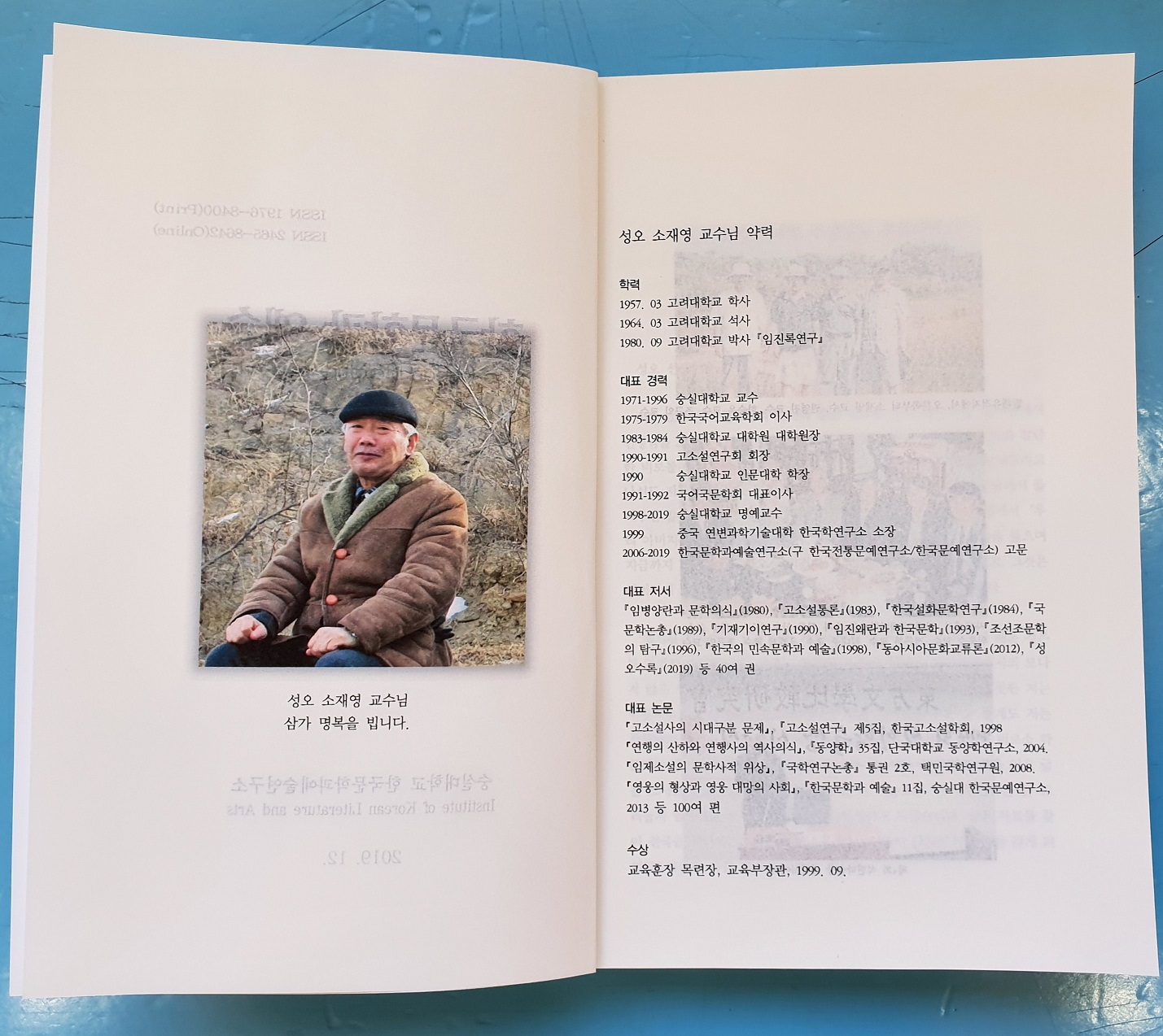 제가 꾸려가고 있는 한국문학과예술연구소의 학술지 <<한국문학과 예술>> 32집이 2019년 12월 31일자로 발간되었습니다. 이번 호는 작년 11월 8일에 소천하신 소재영 교수님 추모호로 꾸며 보았습니다. 그간 국문학계의 어른으로 존경 받아오신 소 교수님은 주지하다시피 숭실대 국어국문학과를 창설하셨고, 돌아가시는 날까지 연구소 고문으로 저희들을 이끌어 주셨습니다. 뜻하지 않게 소천하신 점을 너무 슬프게 생각하며, 이번 호에 실은 밝은 표정의 선생님을 사진으로나마 곁에 모시고 선생님께 늘 샘솟는 힘과 지혜를 간구하고자 합니다.
