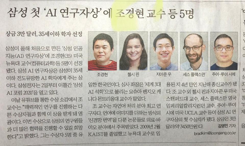 무슨 일이지? 안경을 찾아 쓰고 찬찬이 살펴보니, 경현이에 관한 기사였다. 삼성에서 제정한 ‘AI 연구자상’의 첫 수상자로 경현이를 포함한 다섯 명의 세계 학자들이 선발되었다는 내용이었다. ‘유일한 한국인 수상자 조경현’이 중심에 들어 있는 것은 한국 신문의 기사이기 때문일 것이다. 어쨌든 내 놀라움은 컸다. 그간 열심히 노력하여 AI 분야[특히 딥러닝을 이용한 자연어 처리]의 ‘탁월한 연구’로 인정받아 온 것은 사실이고, 그 덕분일까. 세계적인 명문대학 NYU[뉴욕대학교]에서 불과 4년 만에 테뉴어십[종신교수 직위]을 받는 영광도 누린 바 있다. 그러나 세계적인 기업 삼성이 ‘AI 분야의 전도유망한 연구자들에게 주는 상’의 첫 수혜자가 되었다는 사실을 친구들의 제보로 알게 된 것이 우선 어이없는 일이려니와, 무엇보다 불과 이틀 전의 통화에서도 부모에게 전혀 귀띔조차 하지 않은 녀석의 ‘무심함’은 대체 무어란 말인가.