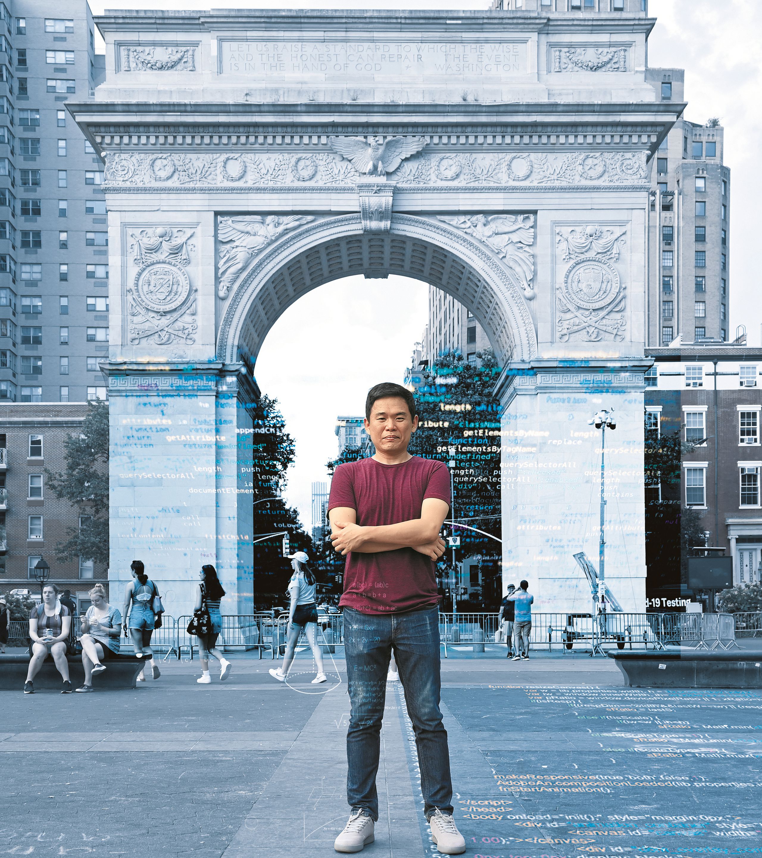 미국 뉴욕대 근처 워싱턴 스웨어 아치 앞에 조경현 교수가 섰다. 핀란드와 캐나다를 거쳐 뉴욕으로 온 이 한국 젊은이는 지금 세계 인공 지능 학계의 주목을 받는 스타다. 조 교수는 말하기를 “AI는 만능도, 마법도 아니다” 라며 “세상을 한번에 바꾸기란 결코 쉬운 일이 아니다” 라고 했다. 사진에 프로그래밍 언어 이미지를 합성했다. 사진작가 서승재, 그래픽 김현국